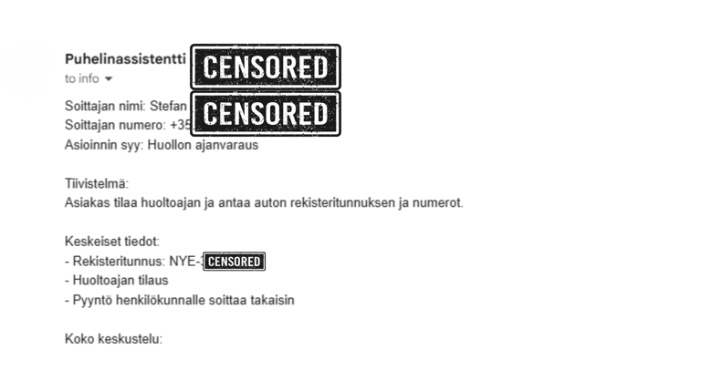 Kun et ehdi vastata, puhelu ohjautuu automaattisesti assistentille. Se vastaa suomeksi, kirjaa soittajan asian ja lähettää sinulle selkeän yhteenvedon sähköpostiin heti puhelun jälkeen.